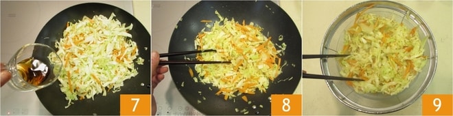 Añade también el vino de arroz 7 y saltea las verduras durante 4-5 minutos: deberán quedar cocidas pero aún crujientes 8. Transfiere las verduras a un colador para eliminar el exceso de líquido, luego extiéndelas un poco con los palillos para preservar mejor el color y la consistencia 9.