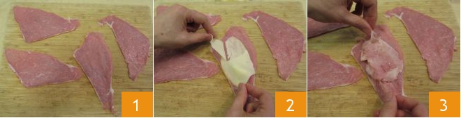 Para preparar los rollitos de ternera con jamón y queso, primero asegúrate de que las lonchas sean bien finas 1, de lo contrario, aplánalas con un mazo para carne. Ahora rellénalas con una loncha de queso cortado finamente 2 y con el jamón 3.