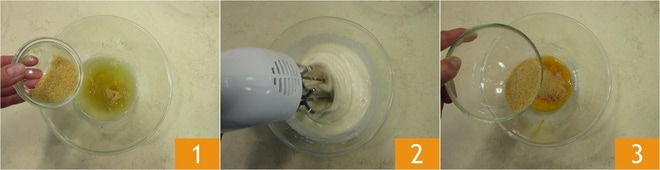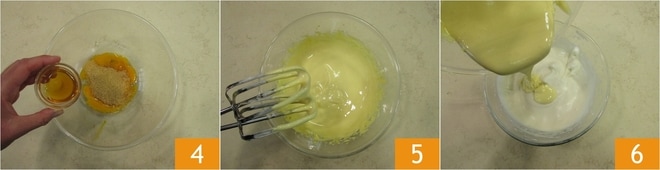 Añadid también la miel 4 y trabajad con las varillas eléctricas hasta que queden claras y espumosas 5. Incorporad a las claras montadas la mezcla de yemas poco a poco 6.
