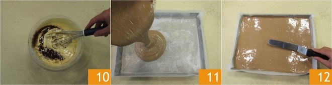 Seguid mezclando con la varilla muy delicadamente hasta su completa absorción 10. Transferid la masa a una bandeja de horno grande de 38x28 cm (en la base) cubierta con papel de horno 11. Nivelad delicadamente usando una espátula, para esparcirla de manera uniforme 12.