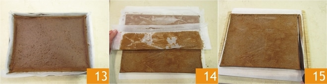 Coced en horno estático precalentado a 200° durante 13 minutos, hasta que esté bien dorado. Sacad del horno 13 y dad la vuelta a la masa de bizcocho de cacao sobre otra hoja de papel de horno, luego despegad con cuidado la que estaba pegada a la masa 14. Colocad de nuevo el papel de horno encima de la masa de bizcocho para mantenerla húmeda y dejadla enfriar. Con un cuchillo podéis igualar los bordes de la masa 15.