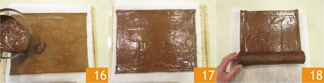 Verted la Nutella en el centro 16 y esparcidla por toda la superficie 17. Refrigerad durante 15 minutos. Ahora enrollad la masa por el lado más largo 18.