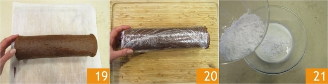 Una vez obtenido el rollo 19, envolvedlo en film transparente 20 y pasadlo al frigorífico durante al menos 45 minutos. Pasado este tiempo, en un bol, verted la nata y el azúcar glas 21.