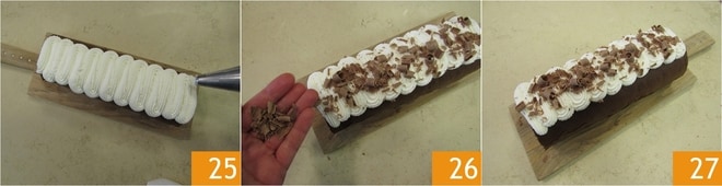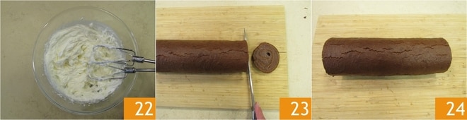 Montad con las varillas eléctricas 22 y pasad la nata montada a una manga pastelera con boquilla de estrella de 10 mm. Retomad el rollo y cortad dos rodajas finas en ambos lados 23 para igualarlo 24.