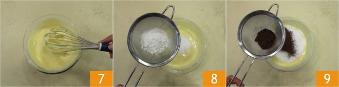 Mezclad delicadamente con una varilla hasta incorporarlas todas 7; no mezclar en exceso. Tamizad luego dentro la fécula 8 y el cacao 9.
