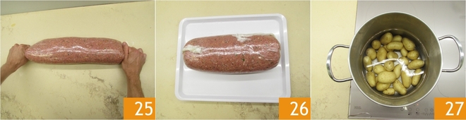 Forma un cilindro compacto y apriétalo bien ayudándote siempre con el film 25. Transfiérelo a una bandeja 26 y déjalo reposar durante 15 minutos en el frigorífico. Mientras tanto, encárgate de la guarnición. Transfiere las patatas a una olla, cúbrelas con agua 27 y llévalas a ebullición. Cocina durante 5 minutos, luego escúrrelas y déjalas templar.