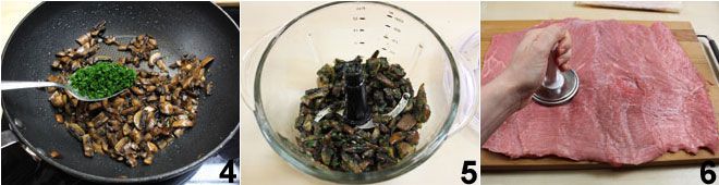 Finalmente, añade una cucharada de perejil picado 4, sala y pimienta y deja cocinar durante otros 3-4 minutos. Pasa todo a una batidora 5 y tritura para obtener una crema gruesa y no demasiado fina. Extiende sobre una superficie de trabajo el trozo de ternera y aplánalo con un mazo para carne 6.