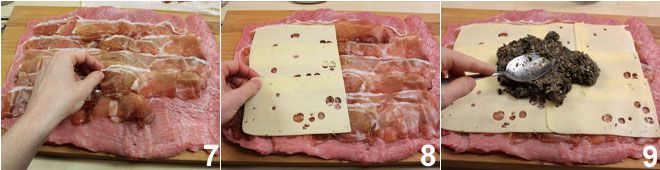 En este punto, comienza a rellenarlo: primero cúbrelo con las lonchas de speck 7, luego sigue con las lonchas de Emmentaler 8 y finalmente extiende la crema de champiñones tibia 9.