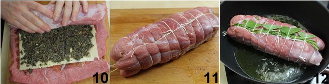 Enróllalo 10 y ata el rollo con hilo de cocina 11, como si fuera un asado, siguiendo las instrucciones que Cómo atar el asado (Atar un asado). Introduce las hojas de salvia y de romero bajo el hilo a lo largo del rollo y colócalo en una sartén con bordes altos, donde has calentado 4 cucharadas de aceite, y cuécelo por todos los lados para sellar bien todas las extremidades del rollo 12.