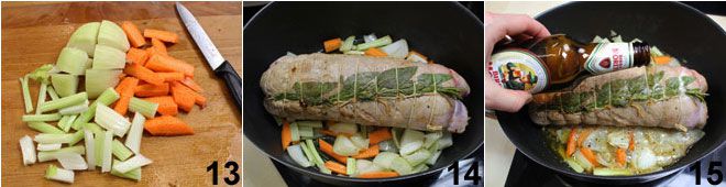 Corta en trozos grandes la cebolla, el apio y la zanahoria 13 y añádelos a la sartén junto con el rollo 14. Sala y pimienta la carne y déjala cocinar durante 40 minutos con una tapa con una apertura. Durante la cocción, rocía el rollo con cerveza cada vez que tienda a secarse demasiado 15. Tras 40 minutos, comprueba que la carne esté cocida con la ayuda de un palillo: al pinchar la superficie del rollo, debe salir un líquido claro. Si el líquido es rosado, la carne necesita cocinarse un poco más.