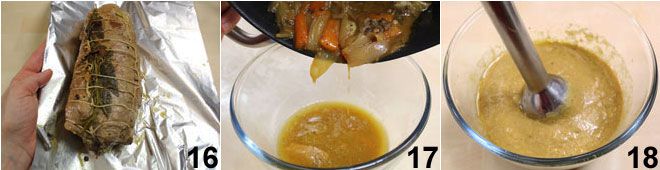 Al finalizar la cocción, coloca el rollo en una hoja de papel de aluminio 16 y ciérralo, para que los jugos de la carne se redistribuyan. Mientras tanto, pasa el fondo de cocción con las verduras a un bol 17 y tritúralo con una batidora de inmersión para obtener una deliciosa salsita que acompañará la carne 18. Corta la carne en rodajas de medio cm de grosor, rocíalas con la salsa y sirve tu rollo a la cerveza con speck y champiñones.