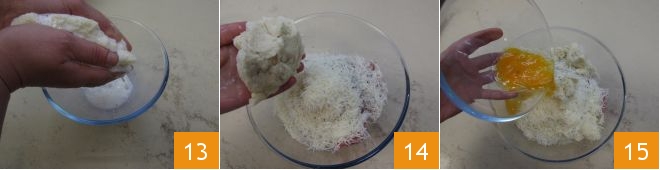Escurre bien el pan en remojo 13 y añádelo a la mezcla 14 aparte rompe los dos huevos y agrégales 15.