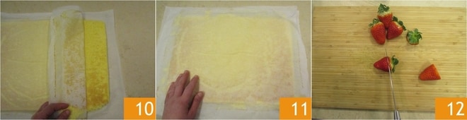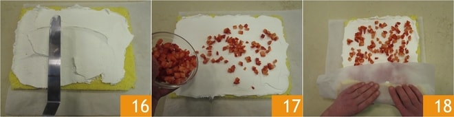 Una vez que la base de bizcocho esté completamente fría, elimina la hoja de papel de horno y rellénala con la nata montada. Ayudándote con una espátula, extiéndela bien por toda la superficie 16. Esparce las fresas encima 17 y, levantando el papel de horno, enrolla el rollo desde el lado más corto 18.