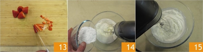 Córtalas primero en rodajas y luego en cubitos 13. Vierte la nata fresca fría en un bol; comienza a montarla con las varillas eléctricas y añade lentamente el azúcar glas 14. Continúa hasta obtener una nata firme, pero no demasiado montada 15.