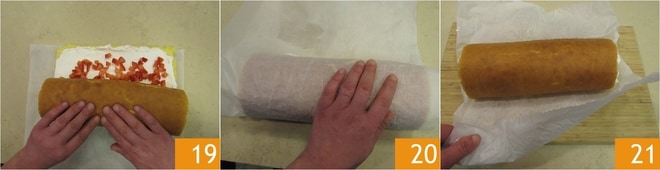 Apriétalo delicadamente 19 y asegúrate de que el cierre del rollo quede hacia abajo 20. Vuelve a envolverlo en el papel de horno 20 y colócalo en el frigorífico durante 30 minutos. Luego retira el rollo y desenvuélvelo 21.