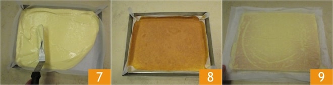 Nivela la superficie con una espátula 7 y hornea en horno estático precalentado a 220° durante 8-10 minutos hasta que la superficie esté dorada y la masa esté cocida 8. Obviamente, ajusta con tu horno, podrían ser necesarios menos minutos o una temperatura más baja si es muy potente. Mientras tanto, prepara una hoja de papel de horno y colócala en la mesa. Tan pronto como retires la base de bizcocho del horno, debes voltearla sobre la hoja de papel de horno 9, de este modo se mantendrá húmeda.