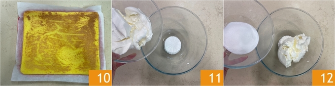Dejad templar la pasta bizcocho 10. Mientras tanto, dedicad tiempo a la crema: en un bol trabajad la ricota con el mascarpone 11 hasta obtener una consistencia lisa y homogénea. Añadid el azúcar glas y mezclad de nuevo 12. Poned 1/3 de la crema en una manga pastelera, servirá para la decoración final.