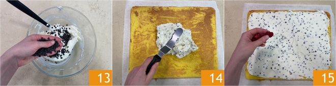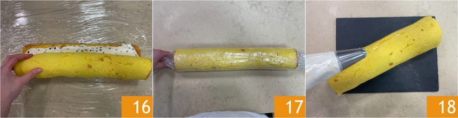 Empezad a enrollar el postre, luego transferidlo a una hoja de film transparente 16. Envolvedlo completamente en el film para estabilizar la forma 17 y dejadlo reposar en el frigorífico durante al menos 1–2 horas. Una vez que esté firme, transferidlo a un plato de servir y decorad la superficie con copos de crema restante 18.