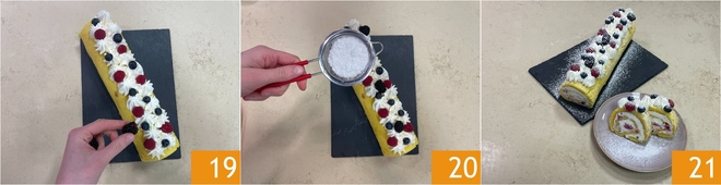 Añadid frambuesas, arándanos y moras alternándolos para un efecto elegante y llamativo 19. Para completar, espolvoread una ligera capa de azúcar glas 20. El rollo sin gluten y sin lactosa está listo para ser servido 21.