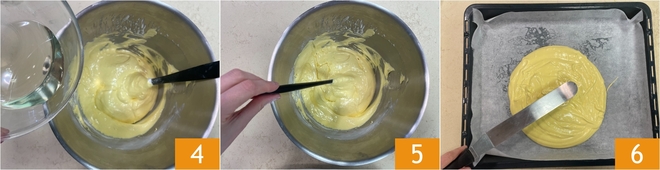 Finalmente, verted el aceite de semillas 4 y amalgamadlo con movimientos lentos y circulares, manteniendo la estructura esponjosa de la mezcla 5. En este punto, preparad la bandeja forrada con papel de horno y extendéis la masa con una espátula 6.