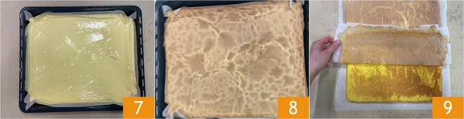 Niveladla de manera regular 7. Cocinad en horno estático a 190°C durante unos 17 minutos, hasta que la superficie adquiera un ligero dorado 8. Una vez listo, dadle la vuelta de inmediato sobre una hoja de papel de horno 9 y retirad la de abajo.