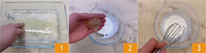 Para preparar el rollo de pandoro con crema de ricotta, empieza por la crema: pon la gelatina en remojo en agua fría 1 y calienta en un cazo 30 g de nata tomados de la cantidad total. Escurre la gelatina e incorpórala a la nata caliente 2, luego mezcla con el batidor para disolverla uniformemente 3 y reserva.