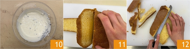 Guarda la crema en el frigorífico durante unos diez minutos 10. Mientras tanto, corta 4 rebanadas de pandoro, de aproximadamente 1-1,5 cm de grosor, tomándolas de la parte central para obtener rebanadas más regulares 11. Con un cuchillo elimina la corteza exterior, pero sin tirarla porque la necesitarás más adelante en la receta 12.