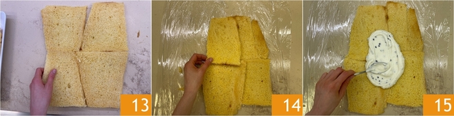 Coloca las rebanadas sobre la mesa y únelas para formar un rectángulo lo más regular posible 13. Extiende un trozo de papel film sobre la superficie de trabajo y transfiere allí las rebanadas de pandoro ligeramente superpuestas 14. En este punto, aplánalas con el rodillo para hacer que se adhieran bien entre sí y queden más delgadas. Cuando la crema esté ligeramente espesa, viértela en el centro del rectángulo de pandoro 15.