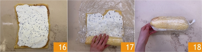 Distribúyela con el dorso de la cuchara por toda la superficie 16. Si resulta demasiado blanda, puedes guardar todo en el frigorífico durante unos minutos. Ayudándote con el film, comienza a enrollar el rectángulo desde el lado corto, apretando bien para formar un cilindro compacto 17. Sella los extremos como si fuera un caramelo y deja que el rollo se endurezca en el frigorífico durante aproximadamente una hora 18.