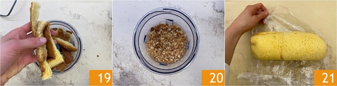Mientras tanto, dedícate a la cobertura: pon las cortezas de pandoro que habías reservado en una batidora 19 y tritúralas hasta obtener un polvo fino 20. Pasado el tiempo de endurecimiento, retira el film del rollo 21.