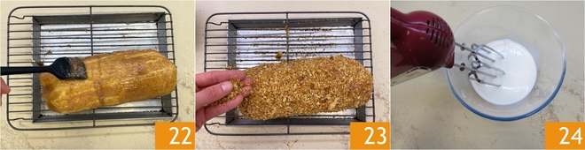 Transfiérelo a una rejilla y úntalo por toda la superficie con la crema de castañas 22. Inmediatamente después cúbrelo completamente con el polvo de pandoro, haciéndolo adherir con las manos 23. Ahora monta la nata restante con las varillas eléctricas 24.