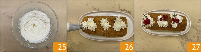 Debe quedar bien firme 25. Transfiérela a una manga pastelera con boquilla estriada y decora el rollo creando rosetones de nata montada en la superficie 26. Completa con grosellas frescas y una ramita de romero. ¡El rollo de pandoro con crema de ricotta está listo para ser servido 27!