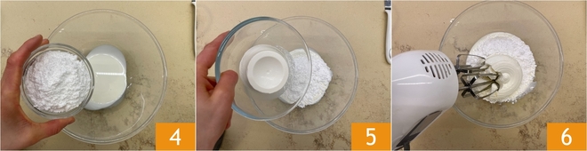 Mientras tanto, vierte en un bol los 70 g restantes de nata, el azúcar glas 4 y la ricotta 6, luego comienza a mezclar con las varillas eléctricas o a mano 6.