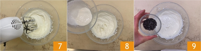 Continúa batiendo hasta obtener una crema suave y uniforme 7. En este punto, incorpora la mezcla de nata y gelatina 8 y mezcla delicadamente, luego añade las gotas de chocolate 9.