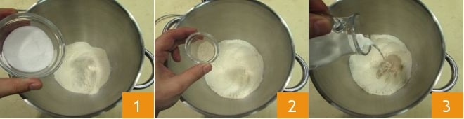 Para preparar el rollo de semillas de amapola, almendras y mazapán, comienza con la masa: en el bol de una batidora equipada con pala, coloca la harina tamizada, el azúcar granulado 1, la levadura deshidratada 2. Vierte la leche poco a poco 3,
