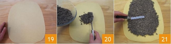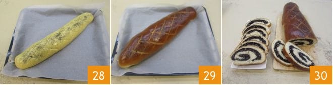 haz incisiones en la superficie con un cuchillo de hoja lisa en diagonales cruzadas para crear un patrón de rombos 28, espolvorea con las semillas de amapola 29 y hornea en horno estático precalentado a 170° durante 30 minutos (o en horno de aire a 150° durante 20 minutos). Al finalizar la cocción, retira el rollo de semillas de amapola, almendras y mazapán, deja enfriar y luego sirve en rodajas 30.