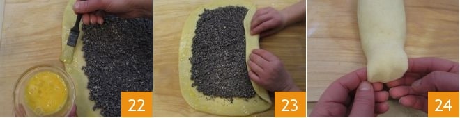 Pincela el borde con huevo batido 22. Enrolla la lámina por el lado largo 23 y sella la masa en las uniones y pliega los dos extremos hacia abajo para cerrar 24.