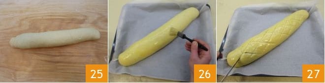 Habrás obtenido tu rollo 25, colócalo sobre una bandeja forrada con papel de horno 26, pincela la superficie con huevo batido 27,