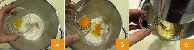 aromatiza con la ralladura de limón 4. Finalmente, añade los huevos y enciende la batidora 5; cuando todos los ingredientes estén integrados, sustituye la pala por el gancho, añade también las semillas de la vaina de vainilla 6,