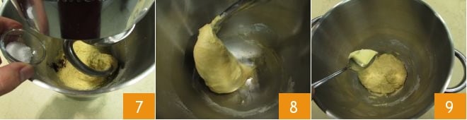 la sal 7, amasa con el gancho 8 y sin detener la máquina añade la mantequilla un trozo a la vez 9 esperando que se integre antes de añadir otro.