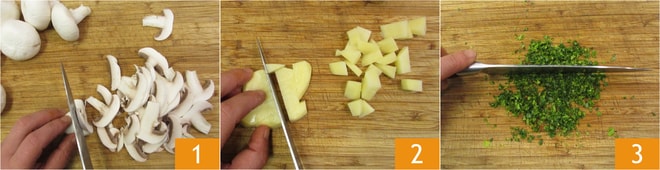 Para preparar los rollos de achicoria con champiñones y Bergkase Superior, primero prepara los ingredientes: limpia los champiñones y córtalos en rodajas muy finas 1, luego pela las patatas y córtalas en cubos de aproximadamente 1 cm 2. Finalmente, pica el perejil 3.