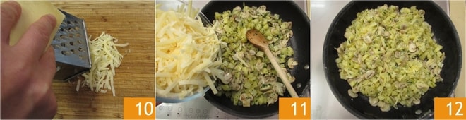 Mientras tanto, ralla el Bergkase Superior con un rallador de agujeros grandes 10. Vierte el queso rallado sobre el relleno ya tibio 11, mezcla bien y reserva 12.