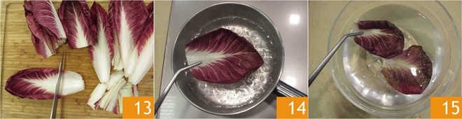 Pasa a la achicoria: elige las hojas más largas y elimina la parte central más dura 13. Escalda las hojas durante unos 30 segundos 14, luego transfiérelas a un bol con agua fría y hielo 15.