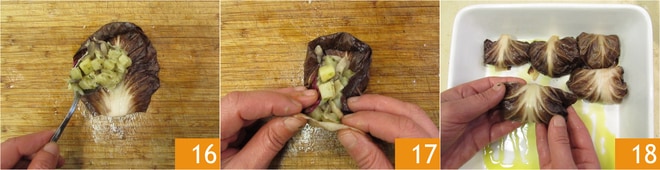 Estás listo para ensamblar los rollos: coloca las hojas de achicoria sobre una tabla de cortar y añade una cucharada de relleno 16, luego dobla ligeramente los lados y enrolla la hoja con cuidado 17. Coloca los rollos obtenidos en una fuente de horno aceitada 18.