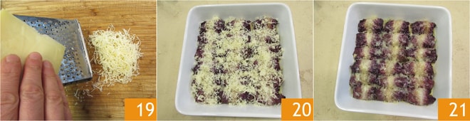 Finalmente, ralla el Bergkase Superior para el gratinado, esta vez con un rallador de agujeros pequeños 19. Espolvorea los rollos con el queso y hornea durante 5 minutos con el grill a 240° 20. Una vez gratinados, los rollos de achicoria con champiñones y Bergkase Superior están listos para ser servidos aún calientes 21.