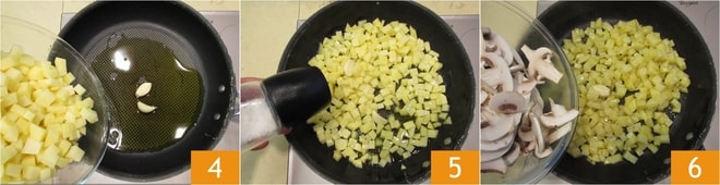 En una sartén, sofríe el ajo con el aceite durante unos minutos, luego añade las patatas 4, sala 5 y cocina durante al menos 7-8 minutos. En este punto, agrega los champiñones 6 y cocina durante otros 4-5 minutos.