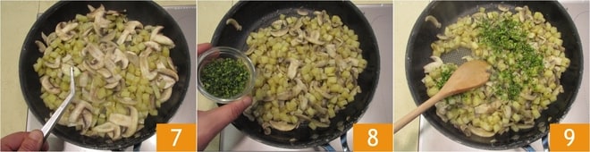 Cuando el relleno esté cocido, retira el ajo 7 y añade el perejil picado 8, luego apaga el fuego y deja enfriar un poco 9.