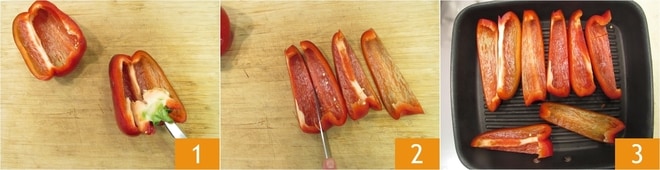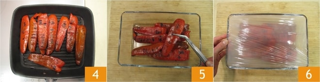 Dejad cocinar durante unos 10 minutos, hasta que estén bien asados pero aún suaves 4. Transferid los pimientos a una fuente 5, cubrid con film 6 y dejad enfriar a temperatura ambiente.
