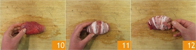 Presionando ligeramente con los dedos, enrollad la loncha de carne sobre sí misma formando el rollito 10. Envolved una loncha de panceta alrededor del rollito 11 y cerradlo con uno o dos palillos 12.