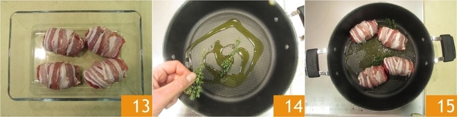 Continuad así hasta terminar todos los rollitos 13. Verted un poco de aceite en la sartén y dos ramitas de tomillo 14. Transferid los rollitos a la sartén 15.